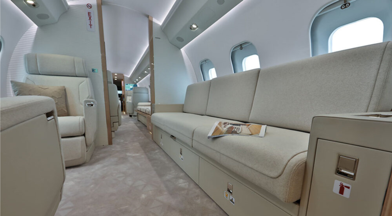Club Seats are patented Bombardier executive single seats capable of berthing and reclining, tracking and swiveling with legrest, and inboard armrest storage. Two (2) stowable tablet holders with power provisions located in the cockpit